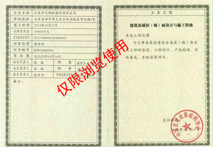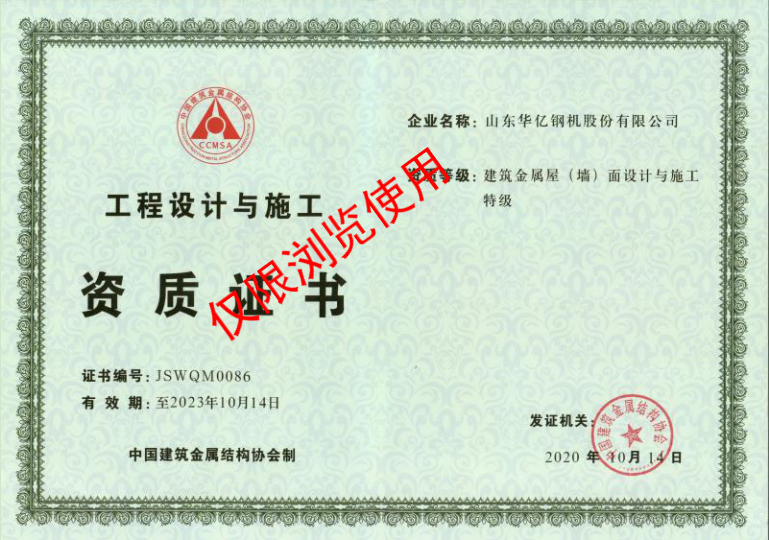 我公司自成立以來,以為社會和客戶創(chuàng)造價(jià)值為己任,勇于創(chuàng)新,不斷進(jìn)取,勇攀行業(yè)高峰。近日成功通過中國建筑金屬結(jié)構(gòu)協(xié)會及分會幾位鋼結(jié)構(gòu)專家的嚴(yán)謹(jǐn)評審,建筑金屬屋(墻)面設(shè)計(jì)與施工特級資質(zhì)證書已順利頒發(fā)!