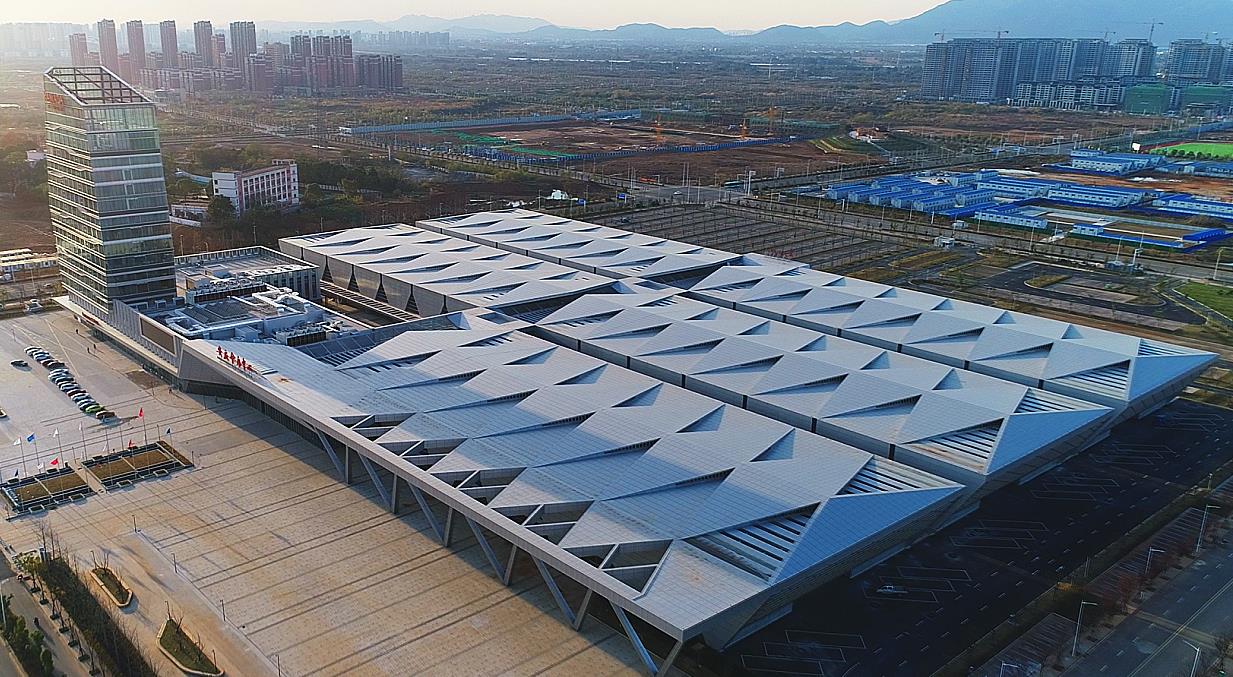 安慶會(huì)展中心建設(shè)總規(guī)模10.15萬平方米左右,項(xiàng)目總投資13.5億元。展覽館由5個(gè)展廳及南北縱橫的共享大廳組成,總建筑面積約4.2萬平方米,每個(gè)展廳凈展面積約5600平方米,建筑高度18米、長108米、寬54米。上部結(jié)構(gòu)均為鋼框架+屈曲約束支撐+張弦桁架,屋面采用鋁鎂錳板金屬屋面。