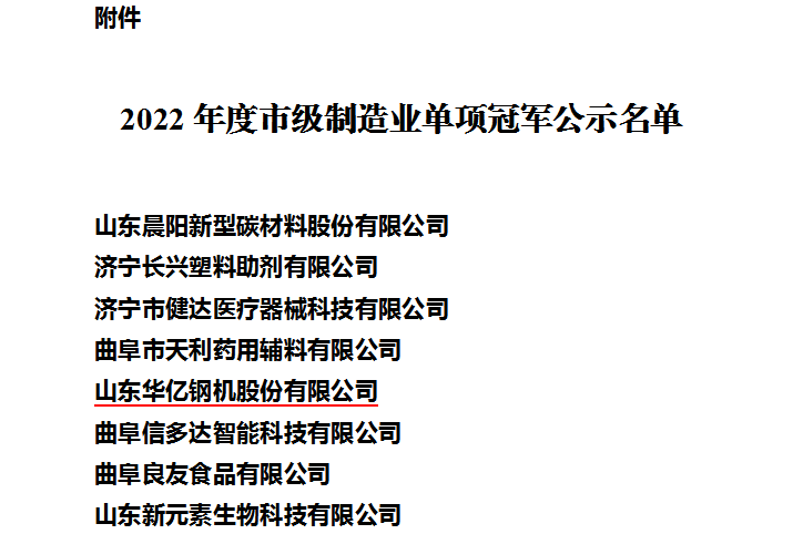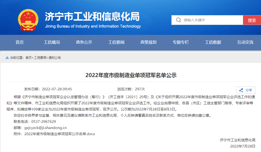 近日,濟(jì)寧市工業(yè)和信息化局組織開展了2022年度市級制造業(yè)單項(xiàng)冠軍企業(yè)評選工作。經(jīng)企業(yè)自愿申報(bào)、各縣(市區(qū))工信主管部門推薦、專家評審等程序,2022年7月28日,濟(jì)寧市工業(yè)和信息化局公布了《2022年度市級制造業(yè)單項(xiàng)冠軍公示名單》,公司成功入選公示名單。