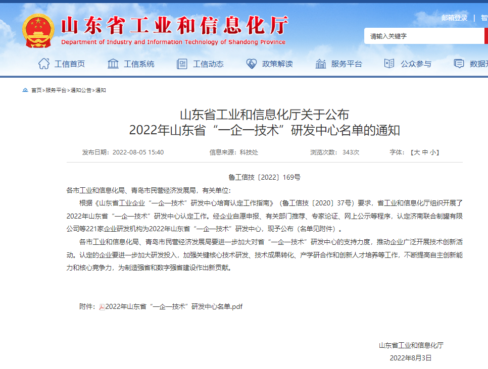 近日,省工信廳公布2022年山東省“一企一技術(shù)”研發(fā)中心名單,公司成功獲批,是曲阜市第8家省級“一企一技術(shù)”研發(fā)中心,同時也是本年度曲阜市唯一一家成功獲批該稱號企業(yè)。