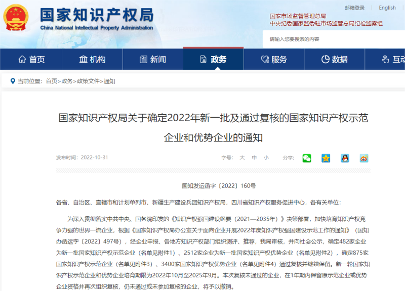 近日,國家知識產(chǎn)權(quán)局發(fā)布國家知識產(chǎn)權(quán)示范企業(yè)和優(yōu)勢企業(yè)評定結(jié)果,我公司憑借在知識產(chǎn)權(quán)創(chuàng)造、運用、管理及保護等方面的多重優(yōu)勢,榮獲“2022年國家知識產(chǎn)權(quán)優(yōu)勢企業(yè)”。成為國家打造知識產(chǎn)權(quán)強企建設(shè)第一方陣的重要一員。