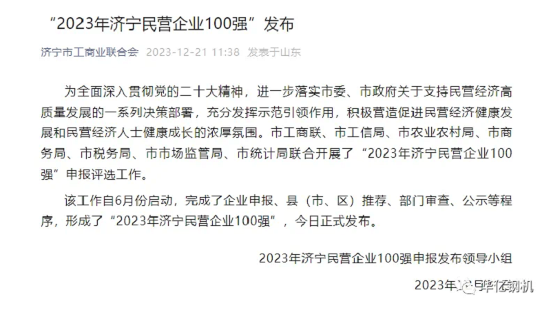 據(jù)了解,為全面深入貫徹黨的二十大精神,進(jìn)一步落實(shí)濟(jì)寧市委、市政府關(guān)于支持民營(yíng)經(jīng)濟(jì)高質(zhì)量發(fā)展的一系列決策部署,充分發(fā)揮示范引領(lǐng)作用,積極營(yíng)造促進(jìn)民營(yíng)經(jīng)濟(jì)健康發(fā)展和民營(yíng)經(jīng)濟(jì)人士健康成長(zhǎng)的濃厚氛圍,濟(jì)寧市工商聯(lián)、市工信局、市農(nóng)業(yè)農(nóng)村局、市商務(wù)局、市稅務(wù)局、市市場(chǎng)監(jiān)管局、市統(tǒng)計(jì)局聯(lián)合開展了“2023年濟(jì)寧民營(yíng)企業(yè)100強(qiáng)”申報(bào)評(píng)選工作。該活動(dòng)自6月份啟動(dòng),完成了企業(yè)申報(bào)、縣(市、區(qū))推薦、部門審查、公示等程序,形成了“2023年濟(jì)寧民營(yíng)企業(yè)100強(qiáng)”,于12月21日正式發(fā)布。