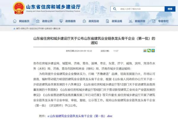 4月9日上午,山東省住房和城鄉(xiāng)建設(shè)廳發(fā)布了《關(guān)于公布山東省建筑業(yè)全鏈條龍頭骨干企業(yè)(第一批)的通知》,公司憑借卓越的綜合實(shí)力和突出的行業(yè)貢獻(xiàn),成功入選。